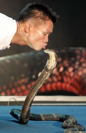 Satu demi satu, kobra dibebaskan ke panggung didirikan di kota resor pantai Thailand, sebagai pawang ular, Khum Chaibuddee, mencium binatang masing-masing dan kemudian pindah ke berikutnya.